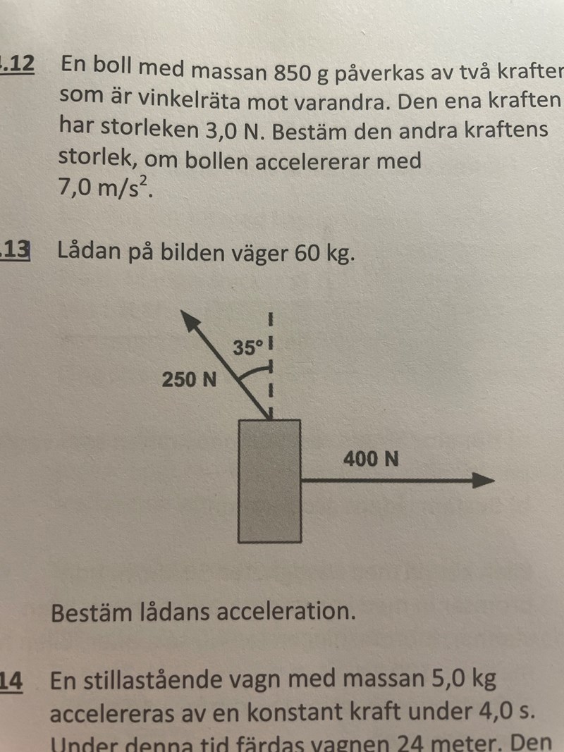 Hej, jag vill verkligen få hjälp med denna uppgift. Jag har försökt lösa ut genom att ta reda på närliggande kateten på den lilla triangeln genom att ta cos(35) •250 , och sedan beräkna den stora triangelns sida . Senare tog jag Pythagoras sats och andvände mig av F=ma för att ta reda på acceleration men jag får fel svar. Hur räknar man ut denna uppgift?