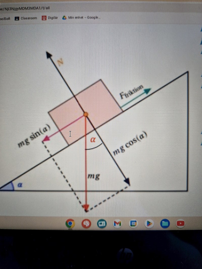 Ta t.ex. detta plan. Där klossen väger 10kg och vinkeln på planet är 45°. Hur beräknar man då klossens acceleration?