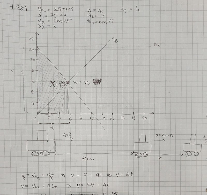 Om jag fattat rätt så är sträckan 75 meter eftersom att efter 75 meter bör hans hastighet vara lika stor som bilen för annars kommer dem att krocka?