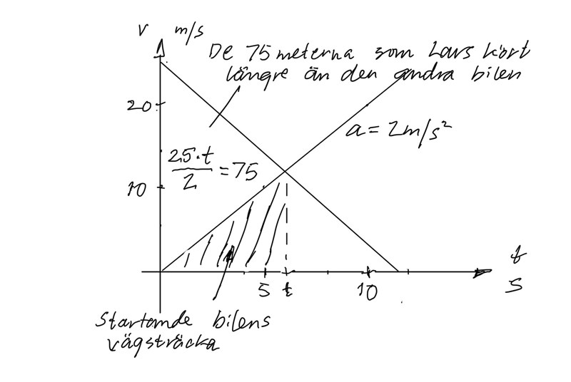 I så fall är förklaringen att det är 75 meter mellan bilarna då Lars upptäcker den andra bilen, dvs vid t = 0.