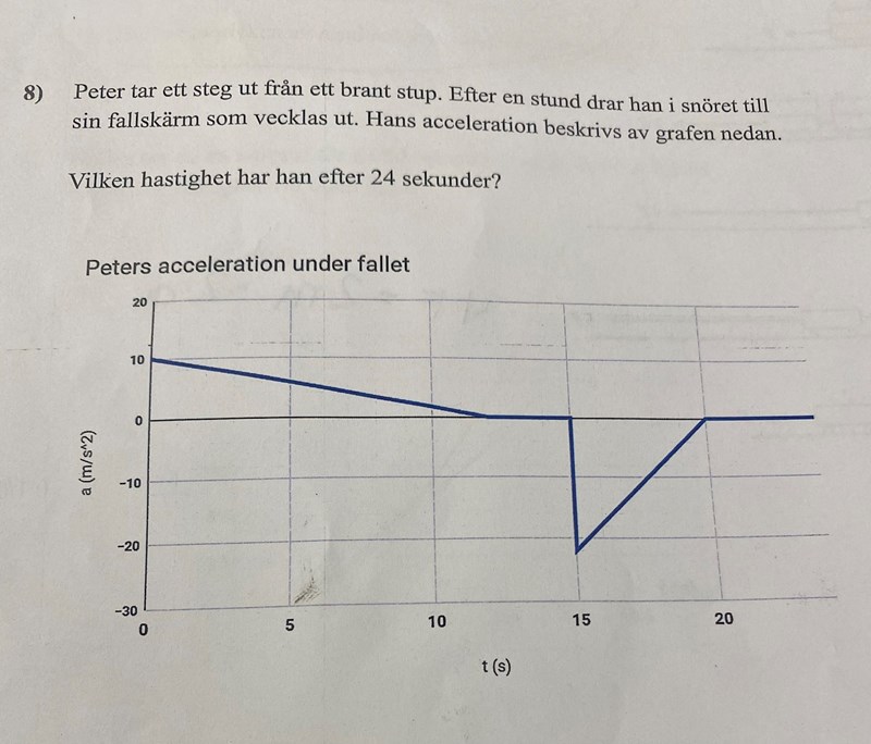 Oj, okej. Jag tänkte att droppet är när han börjar bromsa ner så vid 24 bör han stå stilla. Men då förstår jag inte hur man löser uppgiften :/?