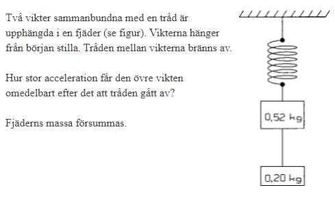 Skillnaden i kraft precis efter det att 0,20kg-vikten klipps bort blir 1,964N. Alltså kommer denna kraft påverka 0,52kg-vikten direkt vid avklippningen. Hänger du med på varför?