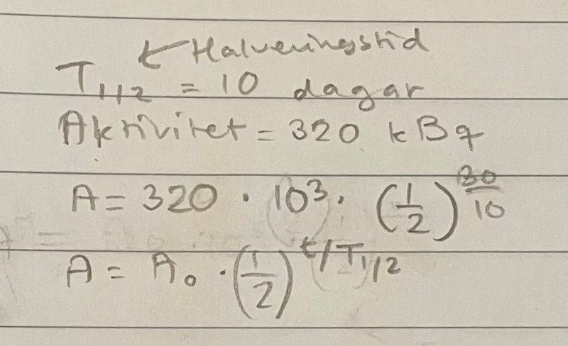 karisma skrev:Det löste sig! Jag hade använt fel halveringstid och även skrivit in 103 i beräkningen istället för att bara skriva kBq efter, därav blev det lite fel.