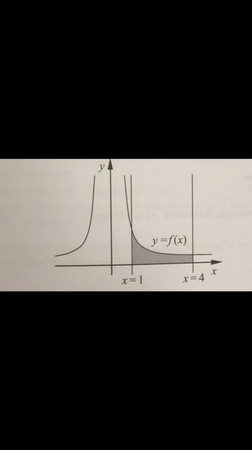 uppg b ska man beräkna algebraiskt arean av det markerade området om området begränsas av x-axeln, grafen till f(x)= 3/ x^2 och linjerna x= 4 och x= 1
