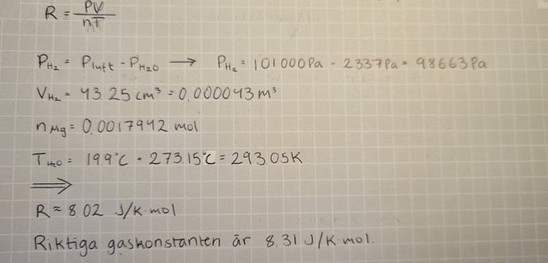 Gjorde en laboration där jag beräknade allmänna gaskonstanten, hoppas att det går att tolka frågan med bara värdena. Varför använder jag mig av magnesiums substansmängd och inte H2:s? Tänk om jag bara skulle beräkna R men bara har värdena (V,P och n) för vätgas i en behållare?