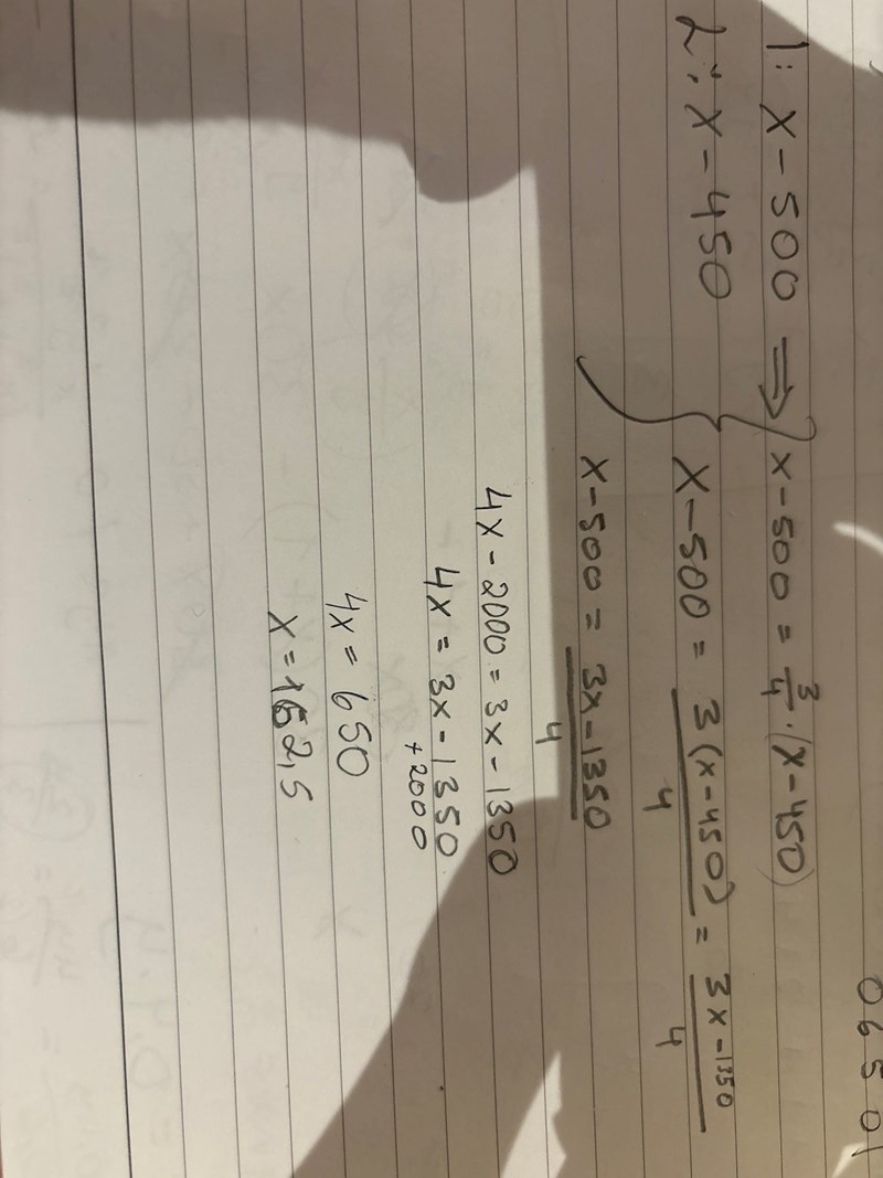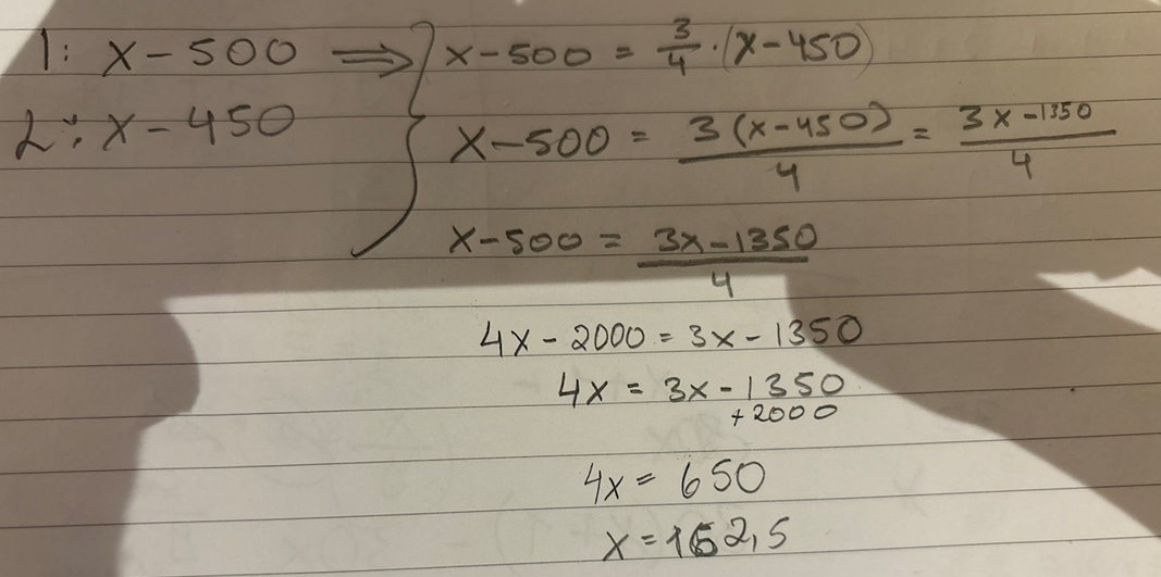 Du vill lösa ekvationen x-500 = (3/4)*(x-450). Börja med att multiplicera in 3/4 i parentesen. Hur ser ekvationen ut när du har gjort detta?