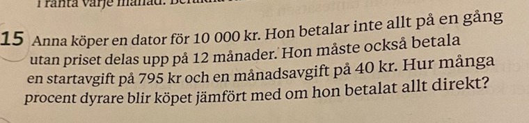 Jag tog först 10 000/12= 833. Sen adderade jag 833+795+40= 1668kr. Efter det tog jag 1668/10000 för att få reda på andelen och det blev 16% vilket var fel. Tacksam för hjälp.