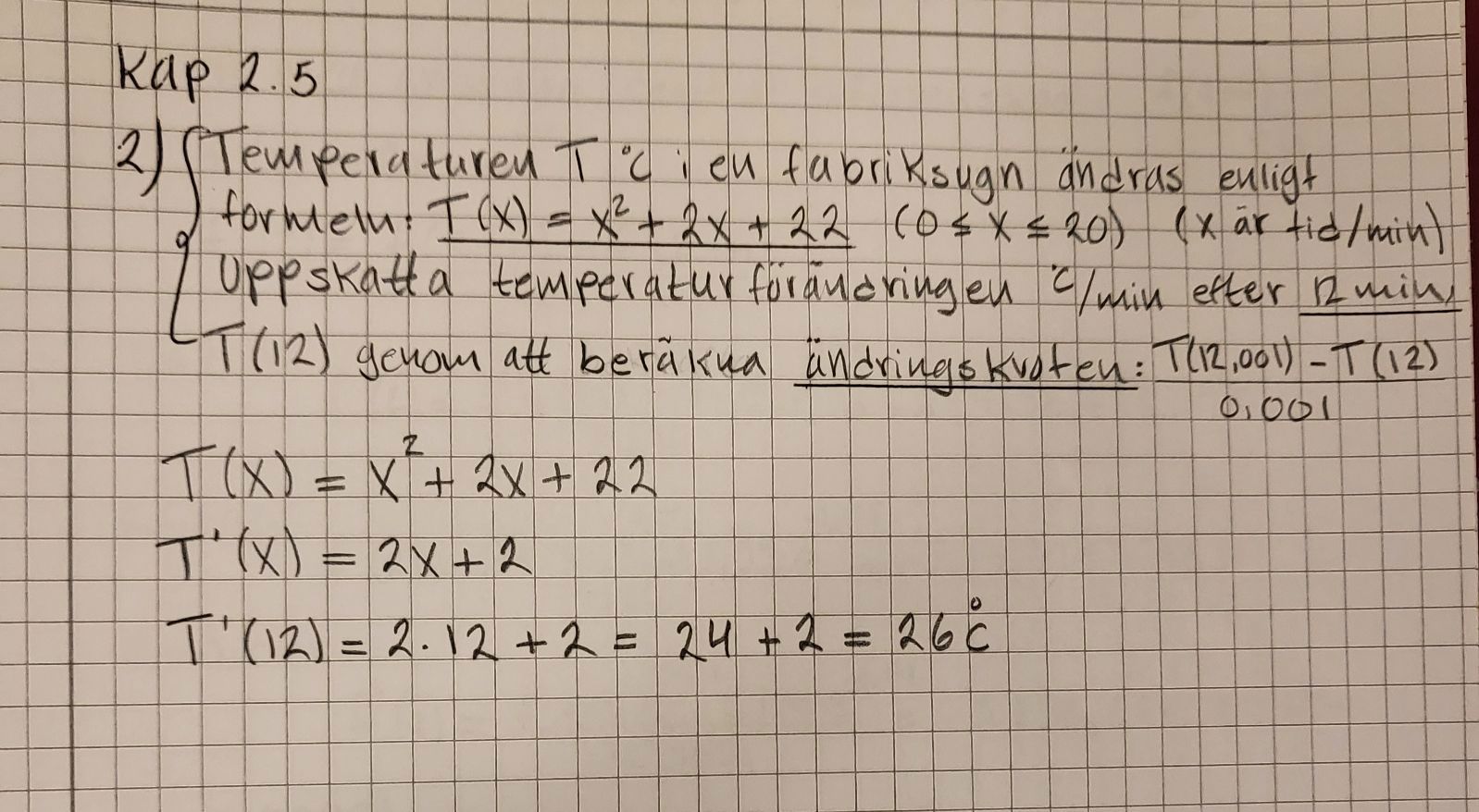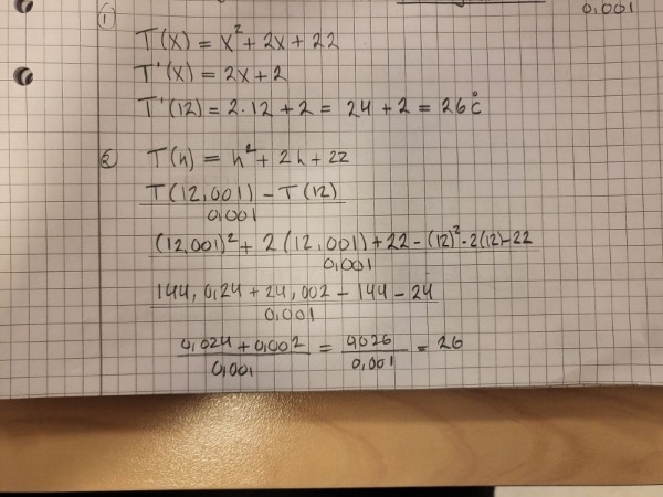 Beräkna ändringskvoten 𝑇(12,001) − 𝑇(12) / 0,001!