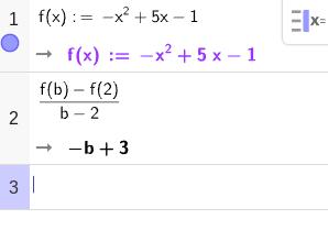 Jag lyckas konstatera att ekvationen för sekanten som går genom f(x) blir y=(-b+3)x+m, och om jag hade haft m hade jag ju kunnat stoppa in x=2 i den ekvationen och få f(2), men jag vet inte hur jag ska få fram m eller om det änns är så jag ska göra. Någon som kan ge mig en ledtråd?