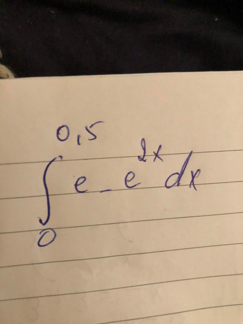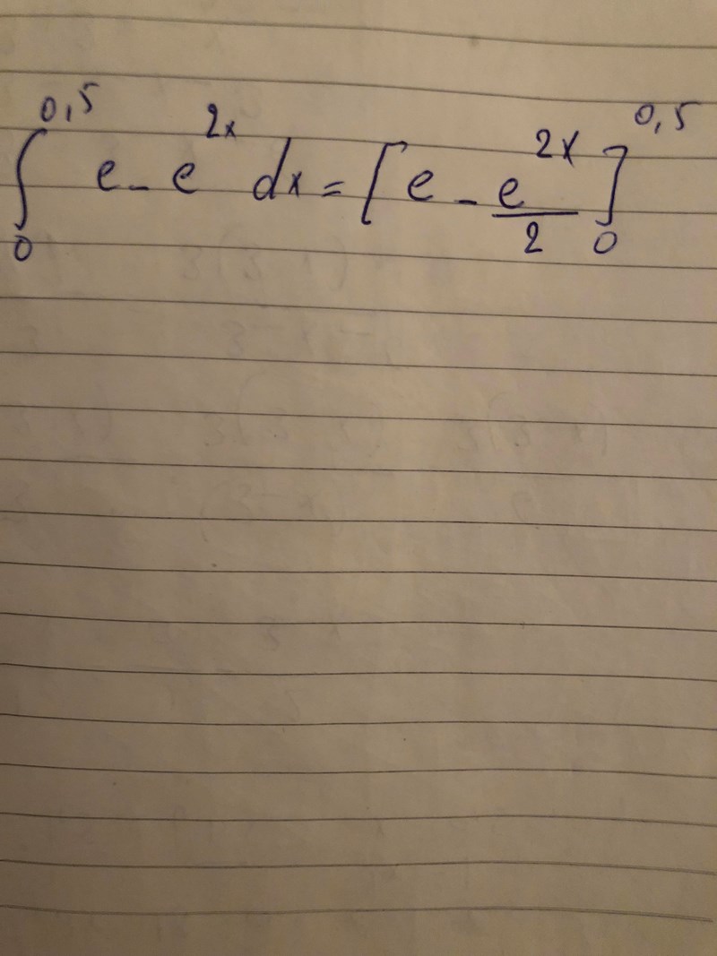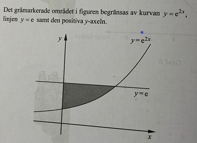 Ska man inte räkna ut arean mellan de två graferna. Detta genom att den integralen av den övrefunktionen y=e minus integralen av den under funktionen blir arean av det grå markerade områden