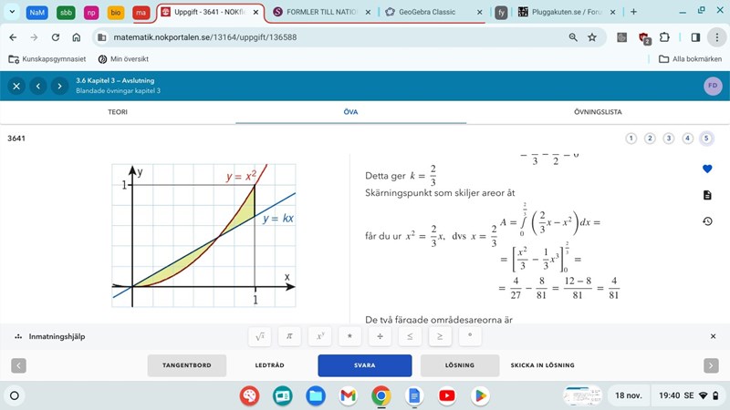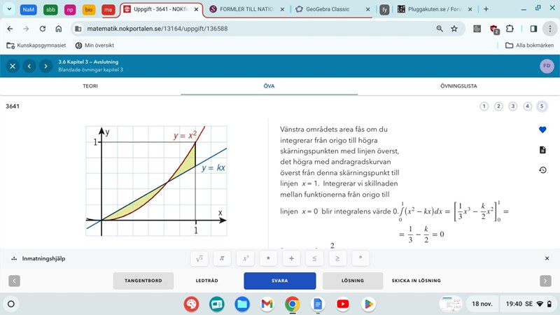 Jag förstår att de i början tar reda på k, men fattar inte varför de tar att x2 är översta funktion från 0 till 1, den e ju bara översta funktion från skärningspunkt till x=1
