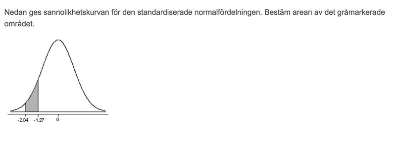 Så långt jag tror jag förstår är att: N(0,1) och att man på något sätt ska kolla i tabellen sannolikheten Pr(Z≤z), sen att pr(-2.04<Z<-1.27) = P r(Z < -1.27) − P r(Z < -2.04)