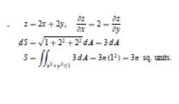 =D(x,y)1+22+22 dxdy=x2+y213 dxdy=...\displaystyle=\iint_{D_{(x,y)}}\sqrt{1+2^2+2^2}\ dxdy=\iint_{x^2+y^2\leq1}3\ dxdy=...