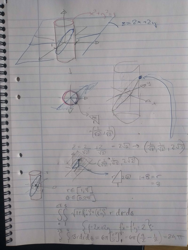 Jag tänkte att ytan är den sneda cirkeln som skapas då ytan skär cylindern. Därför försökte jag hitta gränserna för radien.