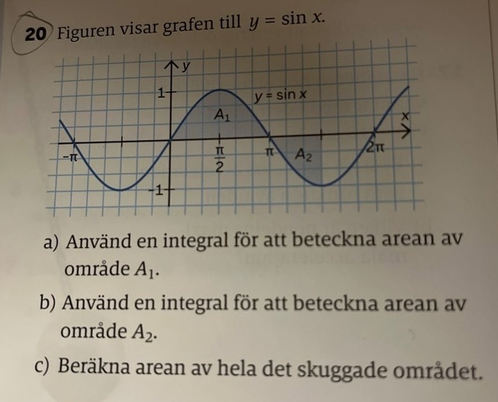 Hej! Förstår inte hur jag ska räkna ut c). Försökt använda mig av integralerna i a) och b) genom att subtrahera A2 integralen från A1. Fattar inte hur jag ska bära mig åt då de wtår i radianer på x-axeln.