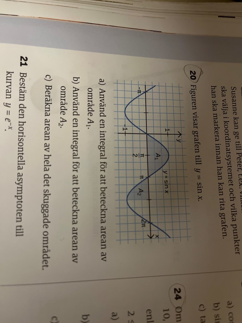 hjälp222 skrev:Hej! Förstår inte hur jag ska räkna ut c). Försökt använda mig av integralerna i a) och b) genom att subtrahera A2 integralen från A1. Fattar inte hur jag ska bära mig åt då de wtår i radianer på x-axeln.