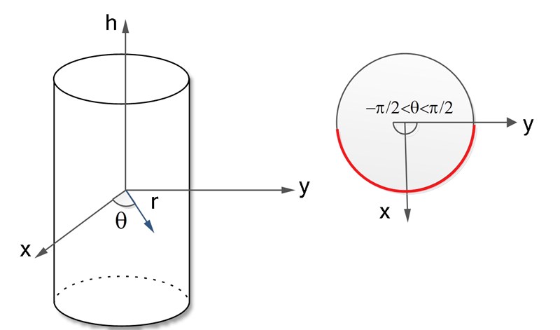 Vi ska borra ett hål i cylindern. Hålet är symmetriskt placerat runt  x-axeln, från x=4 till x=0. Vi behöver ta reda på hur vi ska komma åt den del av mantelytan som påverkas av hålet. Ett sätt att göra det är att konstatera att y och h måste uppfylla y2+h216 y^2+h^2\leq 16 eftersom hålet projicerar en cirkel i hy-planet. Vinkeln θ \theta måste svepa från -π/2 -\pi/2 till π/2 \pi/2 eftersom vi bara är intresserade av "framsidan" av cylindern i xy-planet (den röda delen av mantelytan sett ovanifrån, se bild).