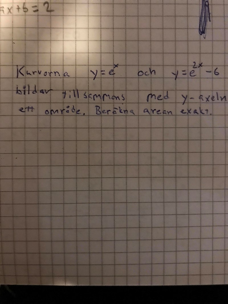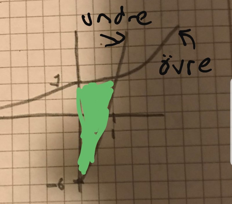 Okej så den generella lösningen för att lösa ut ’areor mellan två grafer’ är att göra en integralberäkning med grafernas skärningspunkt som övre gräns och den undre gränsen avgörs av vilka instruktioner som ges i uppgiften (denna gången var det Y-axeln vilket innebar x=0 men hade det exempelvis varit X-axeln hade man tagit x värdet som ger y=0). Och funktionen man tar är ”övre grafens ekvation-nedre grafens ekvation”?