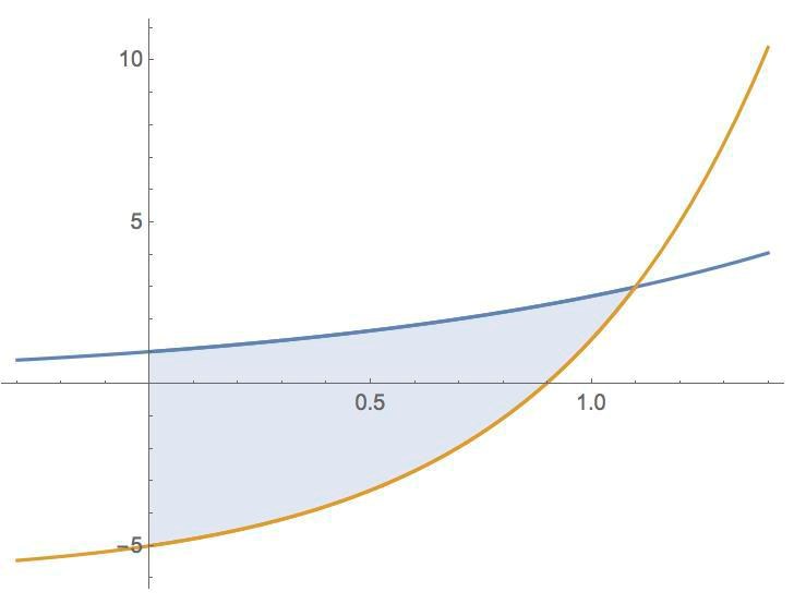 Den kan du beräkna genom att integrera den övre funktionen minus den undre funktionen från x = 0 fram till graferna skärningspunkt.