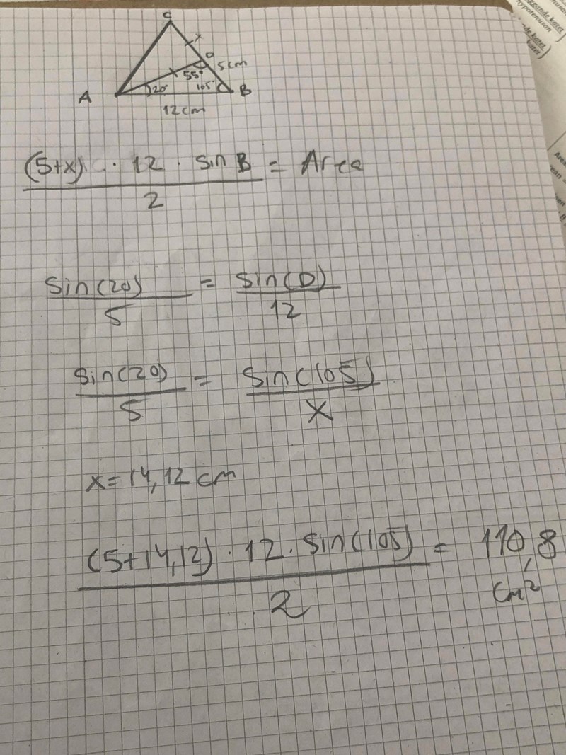I en triangel ABC är sidan AB 12,0 cm. Från hörnet A dras en rät linje som träffar sidan BC i punkten D 5,00 cm från B. VInkeln BAD är 20 grader och triangeln ADC är likbent, dvs. AD=DC.