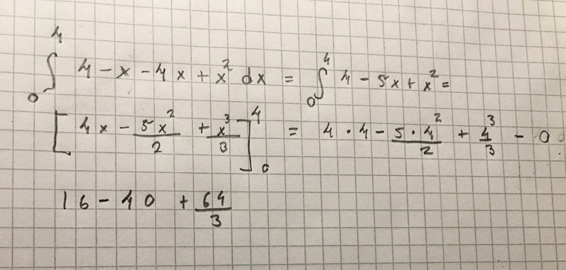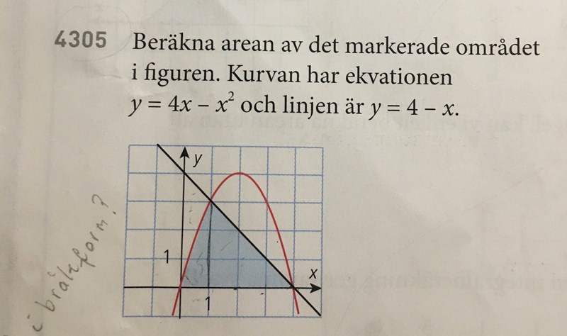 Första delen, mellan x = 0 och x = 1. Denna area kan du beräkna med en integral. Här är parabeln övre funktion och x-axeln (dvs y = 0) undre funktion.