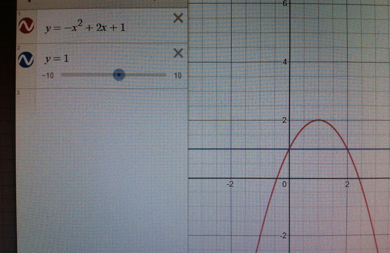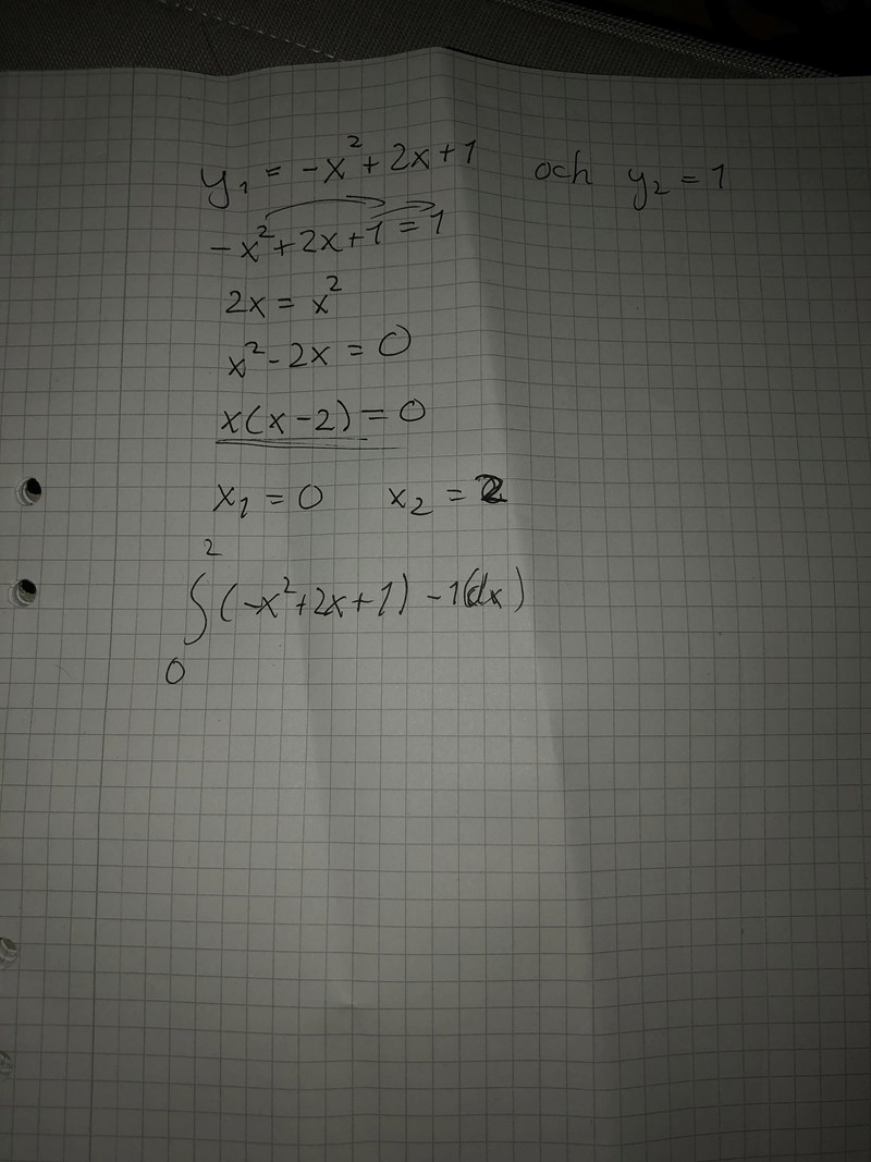 Beräkna arean av det område som begränsas av funktioner y1=-x^2 + 2x + 1 och y2= 1.