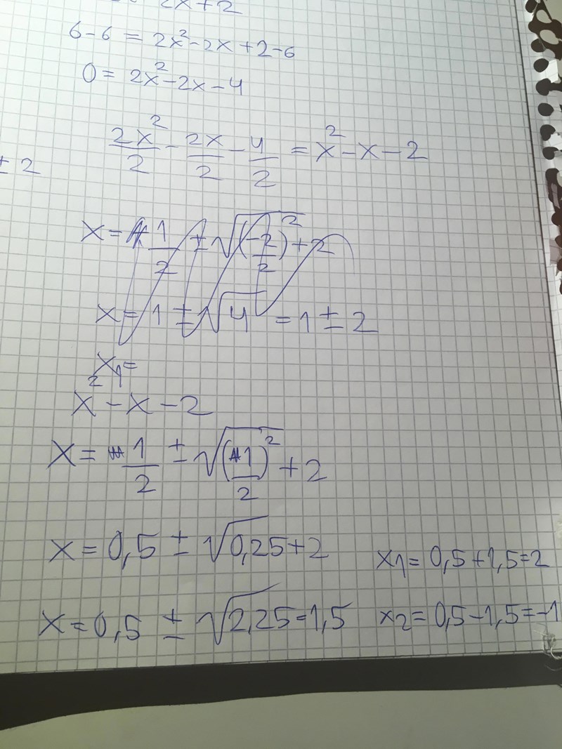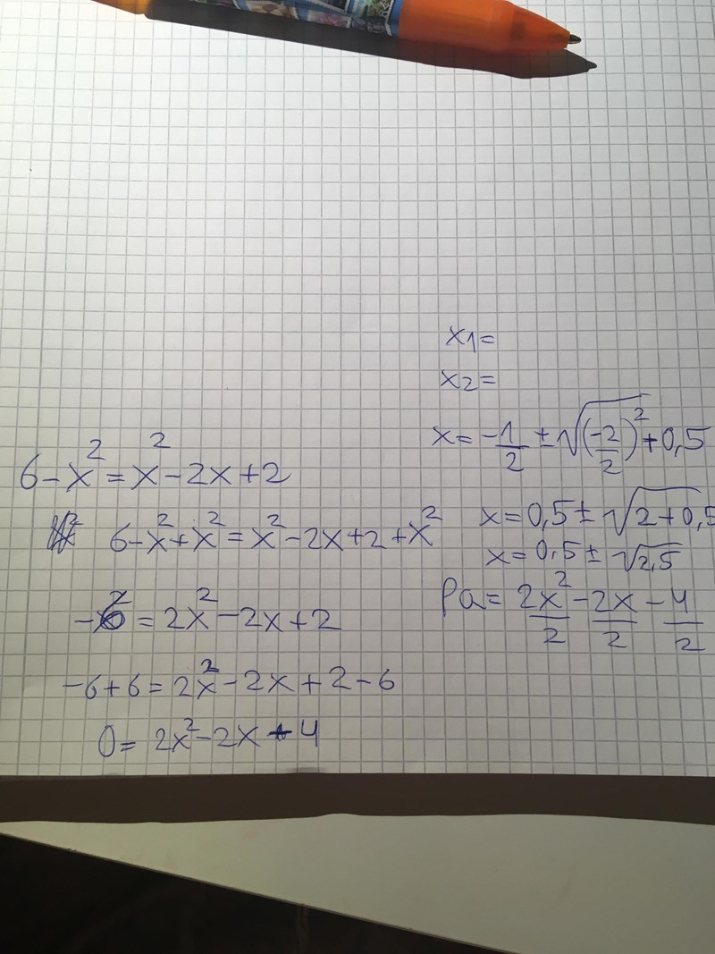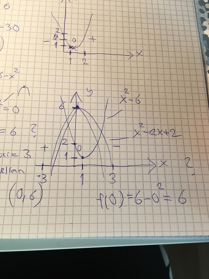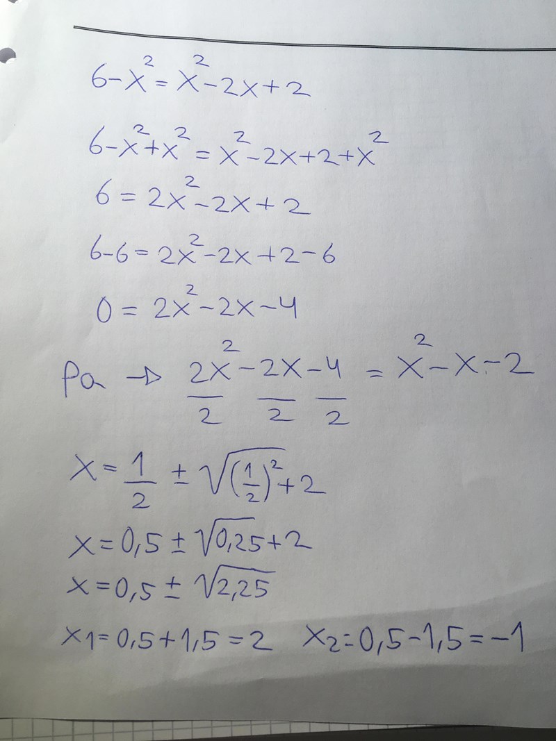 Kurvorna y=6-x2 och y=x^2-2x+2 ska jag beräkna arean på, hur går jag tillväga?? Jag har förstått det som man ska börja med att lösa ekvationen 6-x^2=x^2-2x+2 men vet hur jag får ut svaren som är X1=1 och x2=-2. Tacksam för snabbt svar :)