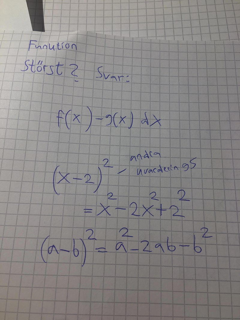 Har beräknat gränserna och nu ska jag beräkna integralen(arean) men funderar på om jag då ska använda andra kvadreringsregeln alltså (x-2)^2 fast då blir ju svaret fel eftersom det blir +2^2 och man byter ju tecken i pq och innan var det ju minus??