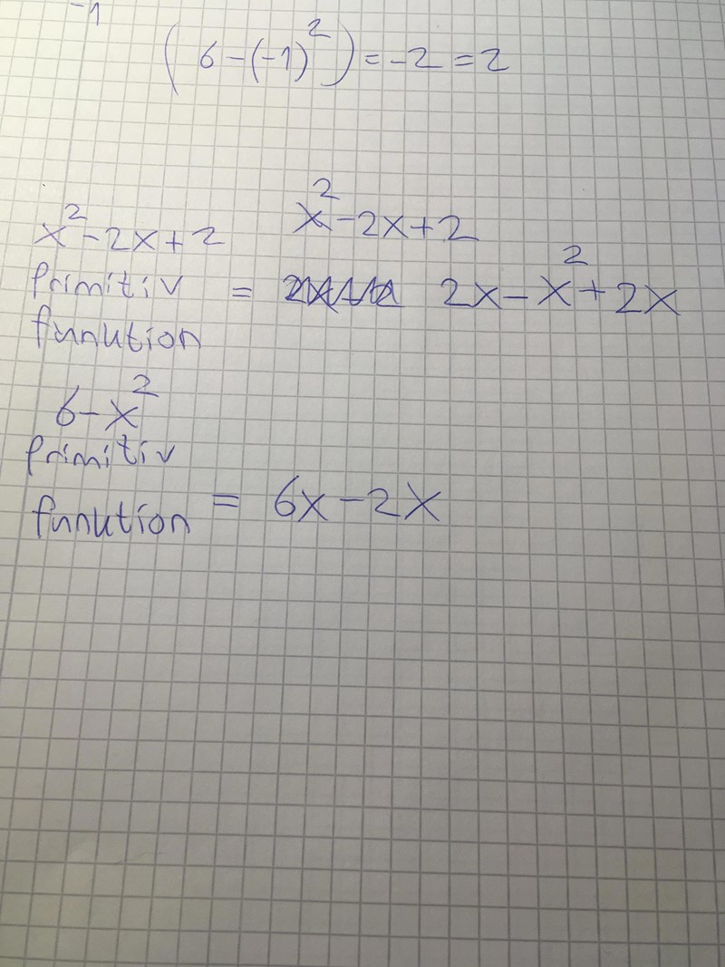 Du verkar ha integrerat och deriverat huller om buller. Den primitiva funktionen till 6 är 6x och den till 2x är x^2, det stämmer, men den primitiva funktionen till x^2 är inte 2x.
