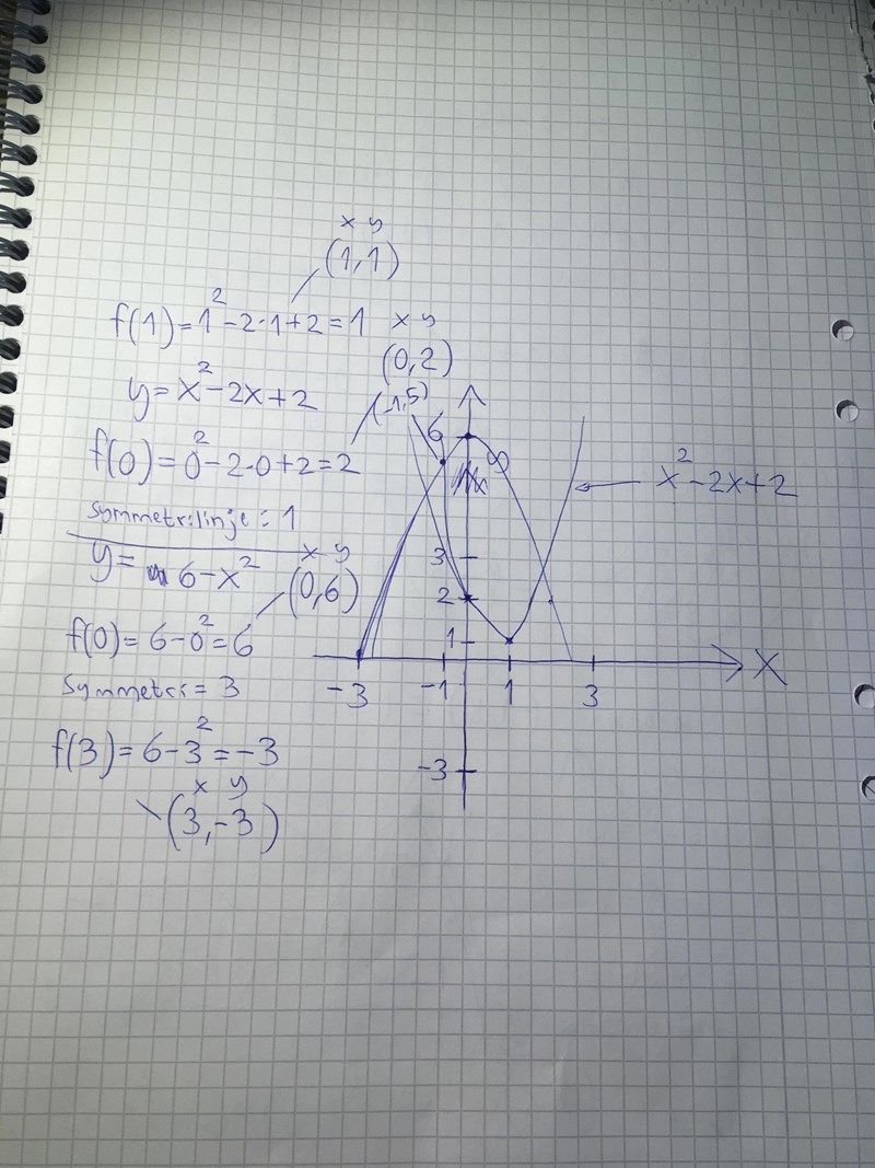 Om man bara avläser vart kurvorna korsar varandra så är det i punkterna ( -1,5) och (2,2)