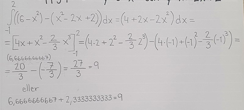 Beräkna arean av det område som begränsas av kurvorna y = 6 − x^2 och y = x^2 − 2x + 2.