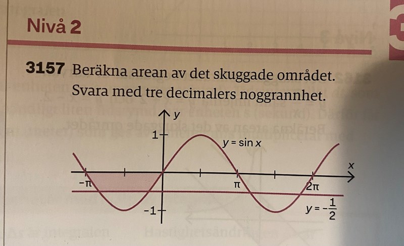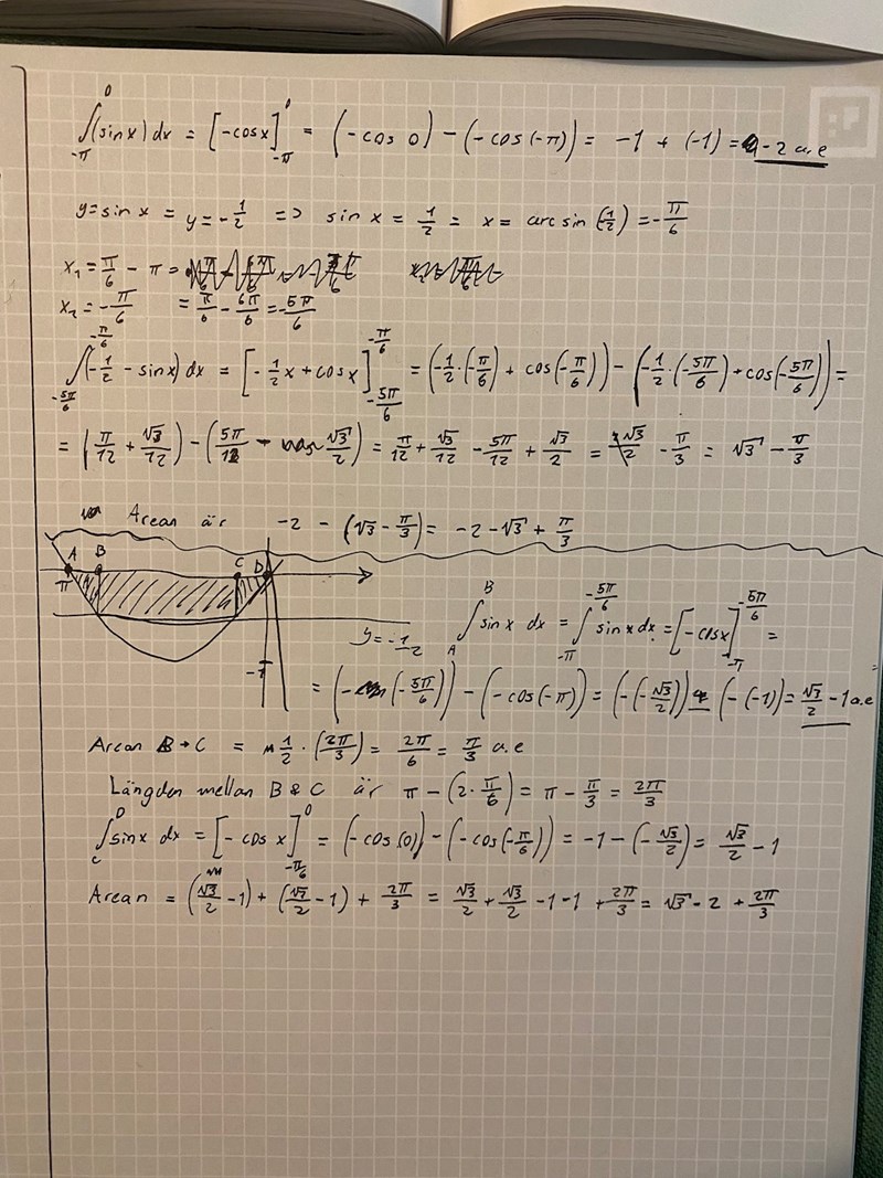 Wandanos skrev:Det blir fel, svaret ska bli ca 1,315. Jag får det svaret om jag tar -2-sqrt(3)-(pi/3) som blir -1,315 men som du sa så kan arean inte vara negativ så jag tar absolutbeloppet. Genom första metoden fick jag just det förutom att jag tar plus pi/3 istället för minus det.