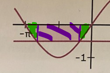 Min första metod var att ta hela arean mellan sinuskurvan och x-axeln och subtrahera med biten mellan y = -0,5 och y = sin x