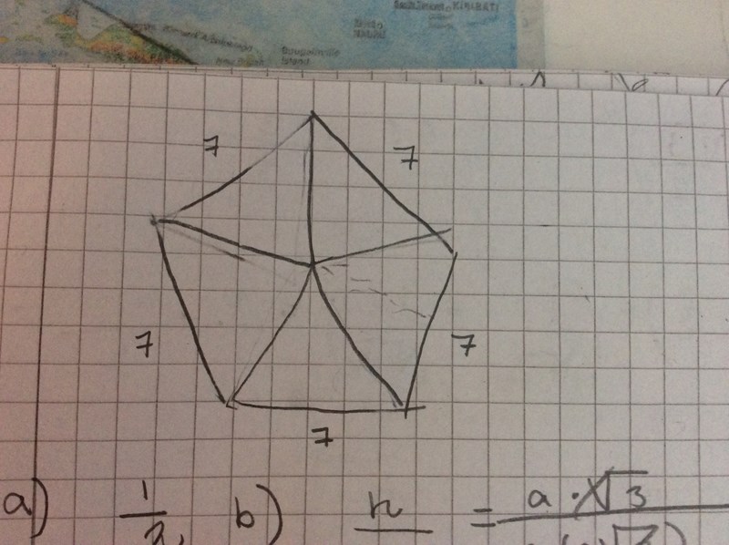 Uppdelningen är helt OK. Jag skymtar ett i dina anteckningar. Det är däremot inte korrekt. Det gäller bara om trianglarna är liksidiga, men det är dom inte. (En 6-hörning har liksidiga trianglar.) De är däremot likbenta. Du behöver tillgång till trigonometri. Vinkeln med spetsen i medelpunkten får du genom 360/7 och sedan får du höjden lämpligen med hjälp av tangensfunktionen.