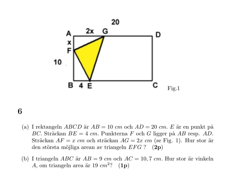 sin(A) = 19*2/(9*10,7) = 0,395, Det finns två vinklar som har detta sinusvärde.