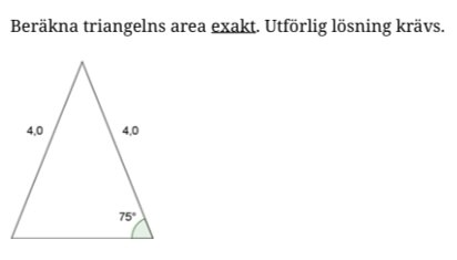 Arean räknas ut genom: a x b x sin c/2 så med denna uppgiften ska man ta 4 x 4 x sin 75/2 eller 4 x 4 x sin 30/2? (Eftersom att 180-75-75=30)