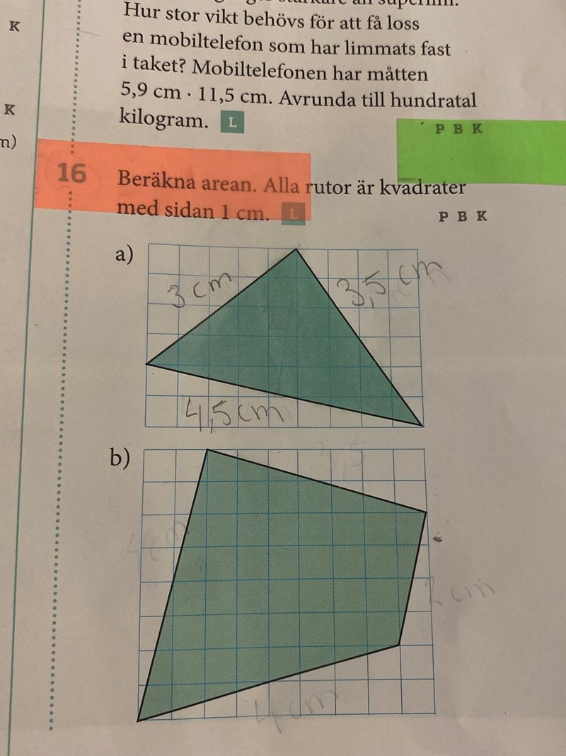 Vi skall alltså beräkna arean av den gröna triangeln Det är inte enkelt att göra direkt då vi varken har bredd eller höjd av denna. Däremot kan vi konstatera att arean måste vara arean av hela rutnätet, 9*6 = 54 cm^2, minus arean av de tre trianglar som ligger utanför den gröna triangeln. Så beräkna arean av dessa, addera dem, och dra det från 54 så har du svaret.