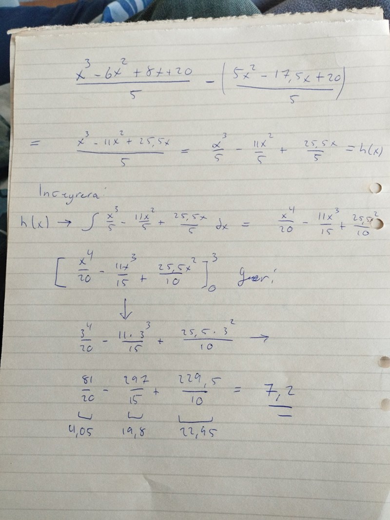 Sen försökte jag först räkna ut integralen av f(x) och sedan g(x) för att sedan subtrahera dessa med varandra, men då fick jag också fel svar. Integralen av f(x) blev (x4/4 -2x3+4x2 + 20x)/5x. Integralen av g(x) blev x3/3 - 3,5x2/2 + 4x. Jag satte in 3 som övre integrationsgräns och 0 /8’ undre integrationsgräns, och fick svaret ≈ 10,61, vilket är inkorrekt.