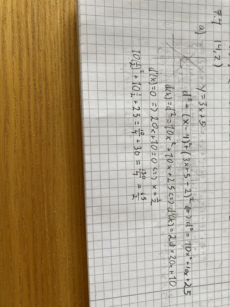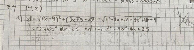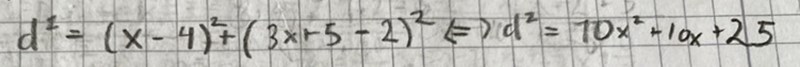 Jag kanske la den fel isåfall, jag läser tekniskt basår just nu och då är det inte indelat som i gymnasiet. Såg några andra trådar där liknande problem låg under ”Matte 2 Logik och Geometri”. Förstår inte hur jag ska minimera uttrycket d^2=10x^2-10x+25. Jag har försökt att derivera uttryckt för att ta fram extrempunkterna men får fel svar.