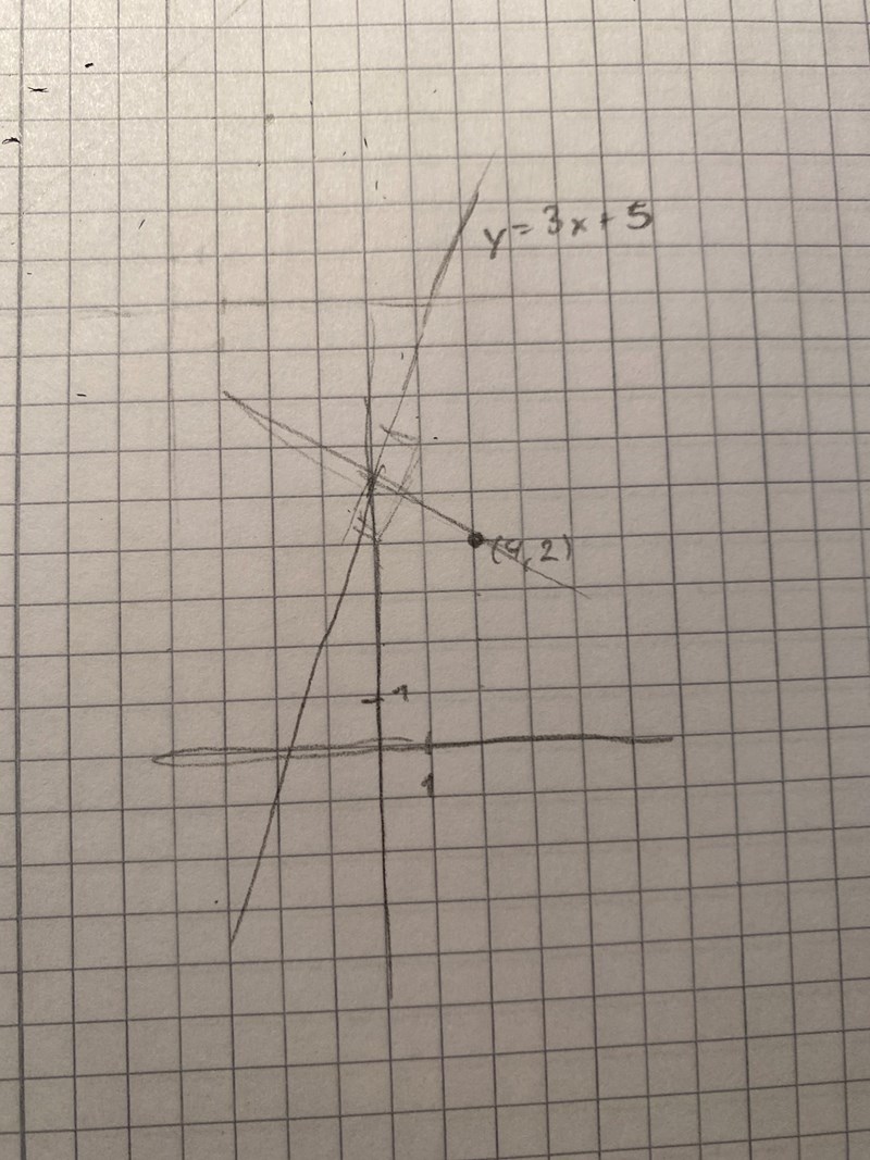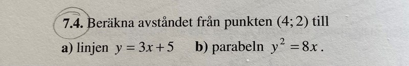 Hej, förstår inte hur jag ska beräkna avståndet mellan punkt (4,2) och linjen y=3x+5. Har använt mig av avståndsformlen men inte kommit längre än så. Hur går jag vidare?