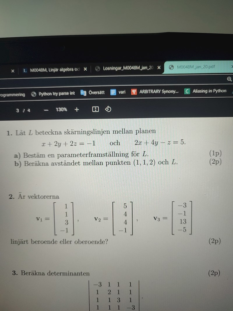 v = (-2,1,0) vilket står i facit. Du sätter v till (1,1,2) men det är ju P.