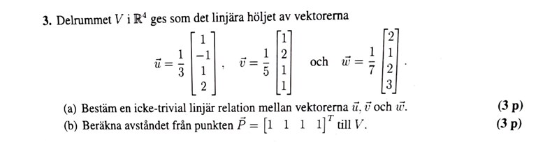 Fråga b) förstår jag inte alls hur man ska lösa den när det är flera vektorer i ett delrum. Jag vet att det är D=|projnPQ| men det är så confusing när jag har flera vektorer än liksom ett plan eller en linje