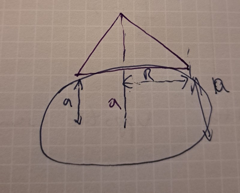 Jaha ok då bildas det en liksidig triangel med sidorna a. Då förstår jag. Så tyngdpunkten på triangeln vid kanten mäts från toroidens rotationsaxel i mitten till mitten av triangeln så vi får R+h/3. För att skriva h i termer av a kan man använda pythagoras sats kanske