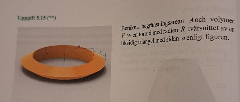 Men denna bild verkar ej stämma med hur R ser ut i uppgiften? Är den strecken linjen i mitten av toroiden även R? Så rotationsaxeln för triangeln är mitten av toroiden?
