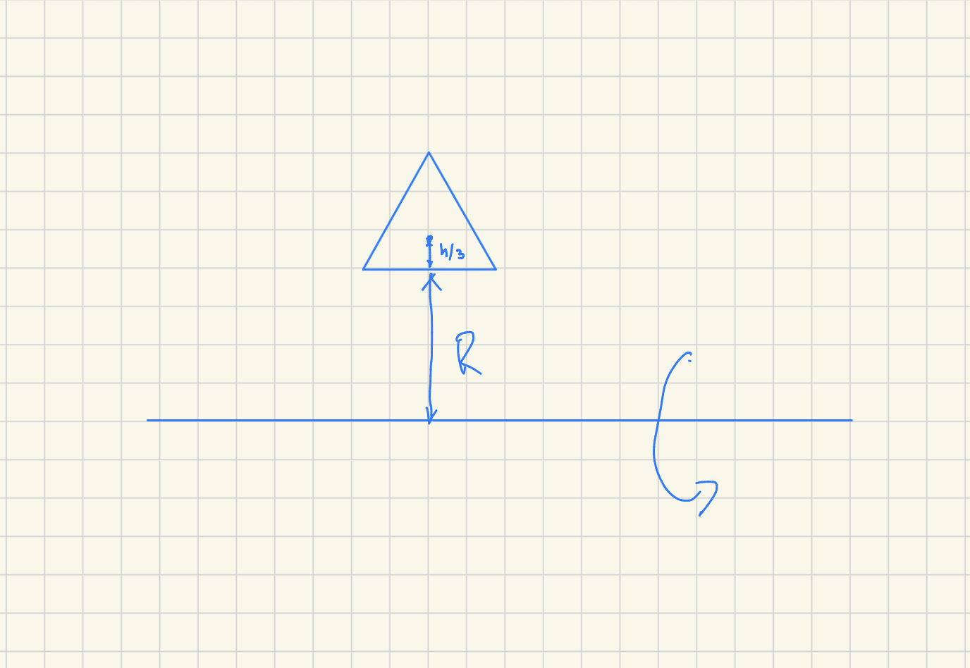 Jag förstår inte och ser inte hur tyngpunktens avstånd till axeln är R+h/3 om figuren från AI eller min egna är fel.