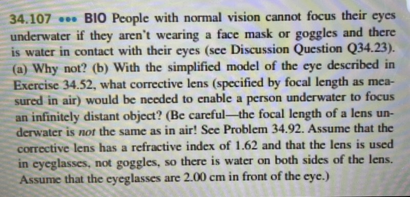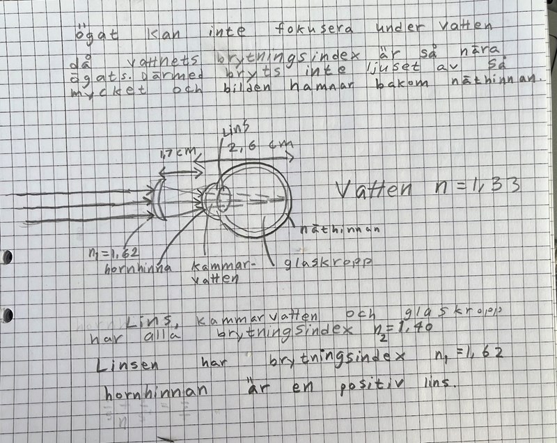 Beräkna bildbrännvidden? (focal length) för glasögonen under vatten.
