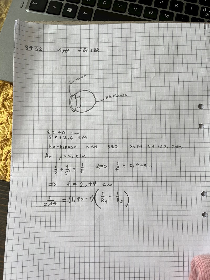 Hej! Så förut tänkte jag att R =2*f. Men det gäller ju inte för en lins kom jag på sedan. Jag förstår inte hur jag ska göra för att reda på kurvradien för hornhinnan eftersom det är två radier som är obekanta, en för ena ytan och för linsens andra yta, R1 och R2. Så linsmakarens ekvation verkar inte fungera direkt. Har du något tips? Tack!