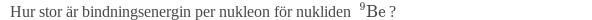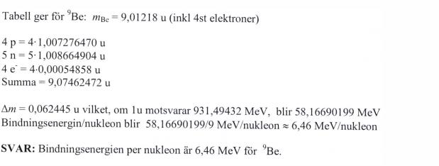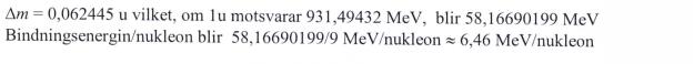 Jag ska räkna varje partikels massa (och adderar dem tillsammans) och därmed gånga sen med 931 MeV, för att få den totala energi. Sen dividerar jag bara med 9 för veta energi för en partikel. Men då får jag inte rätt svar.
