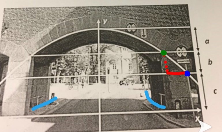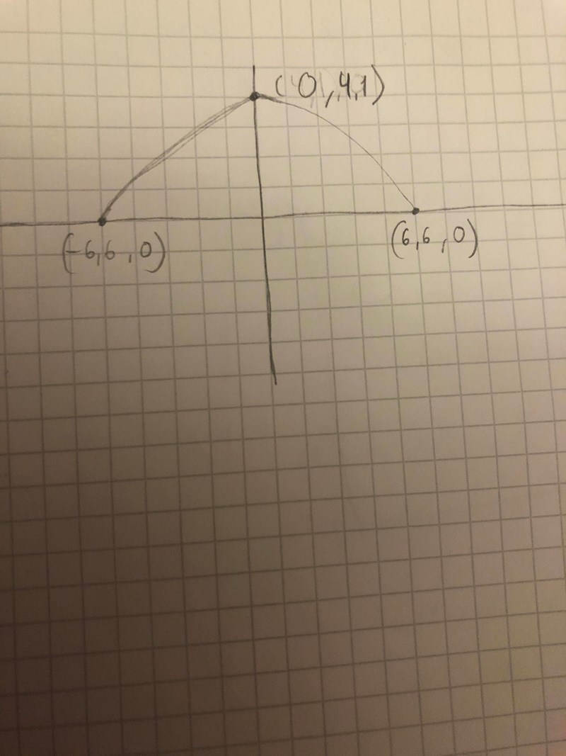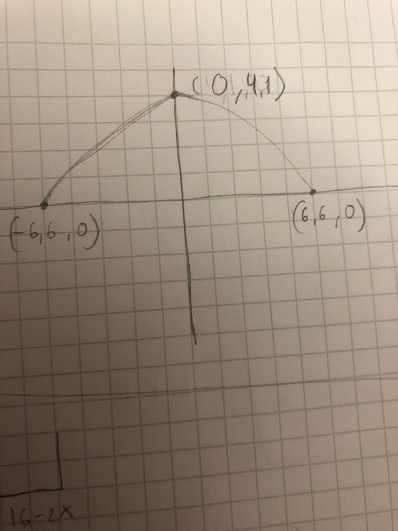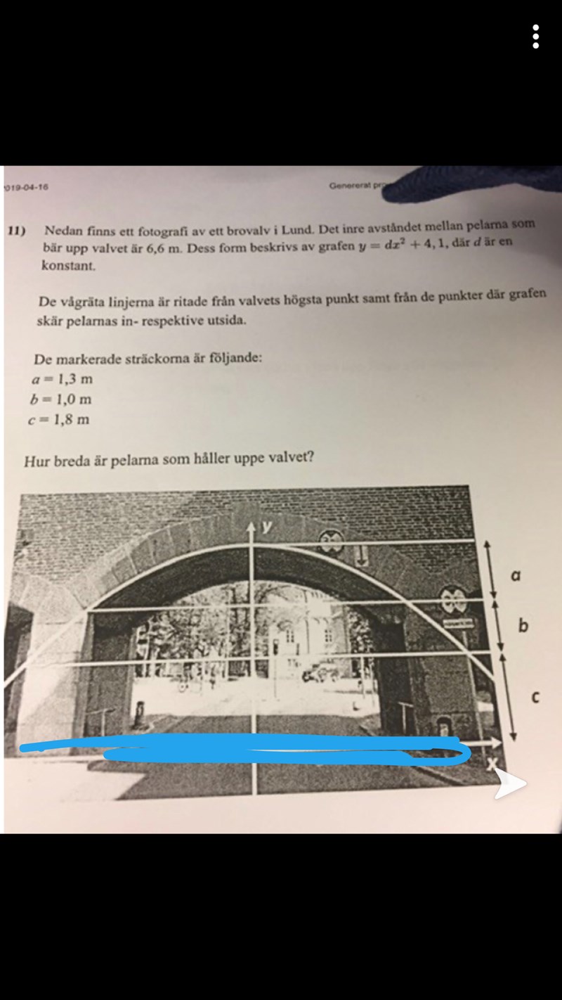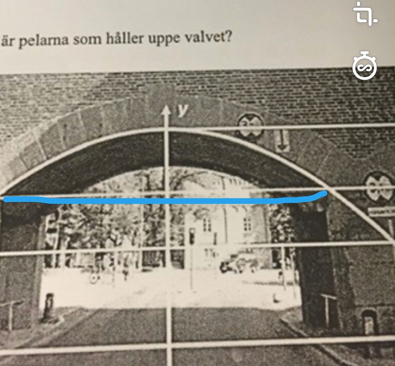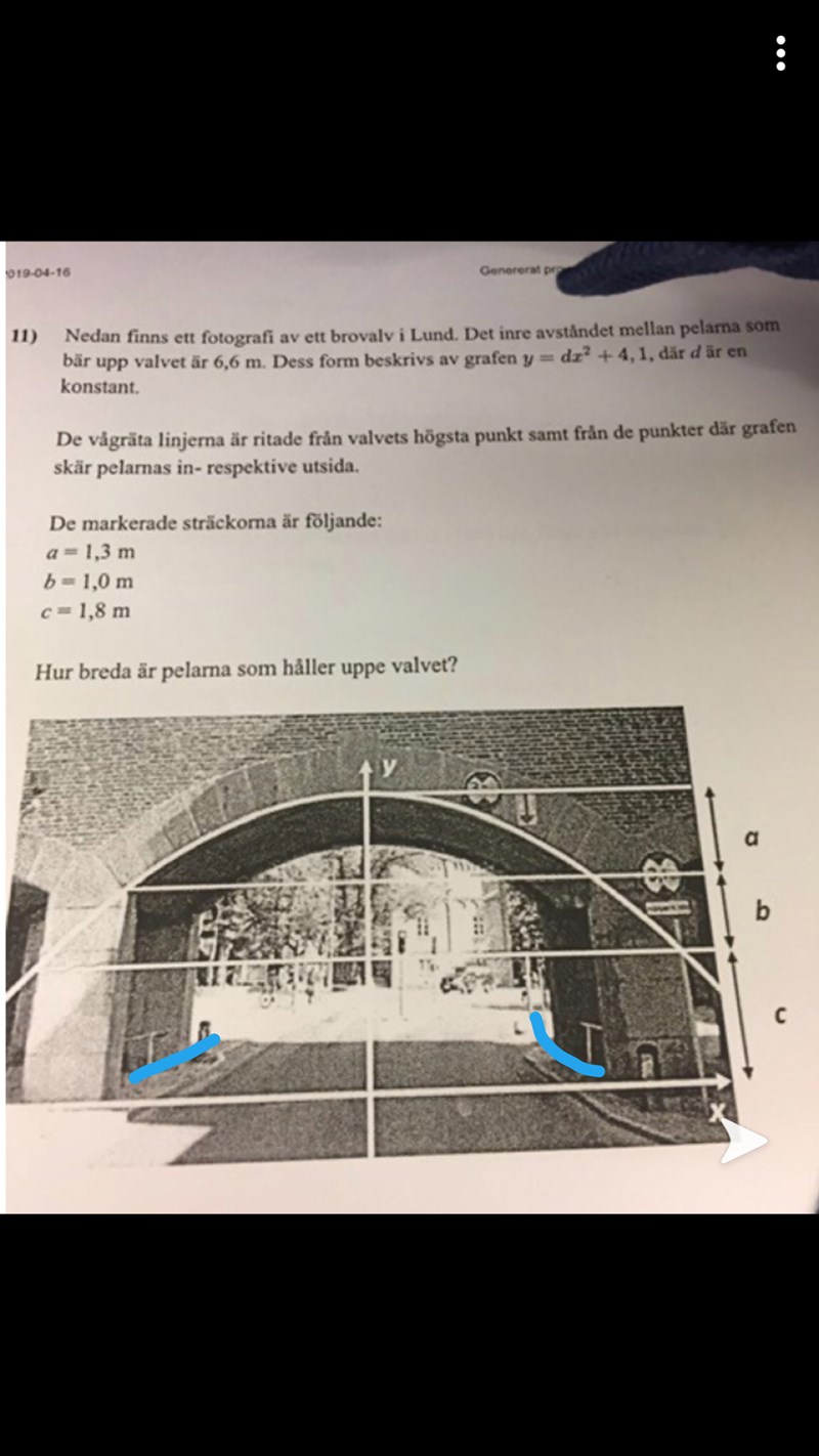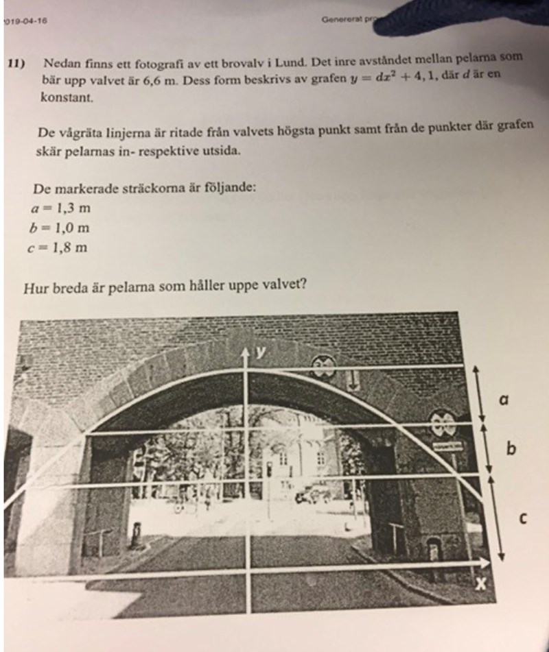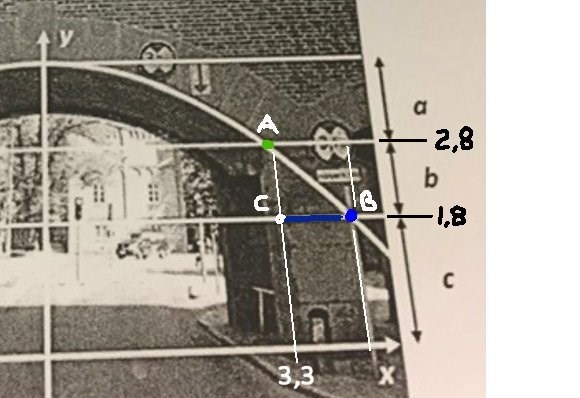 Det är det nog inte. Du ska använda kurvans ekvation, att det är 6,6 m mellan valven, och att du vet a och b. Du har alltså koordinaterna för de två punkter där kurvan i figuren skär högerpelarens sidor och kan ställa upp ekvationer.