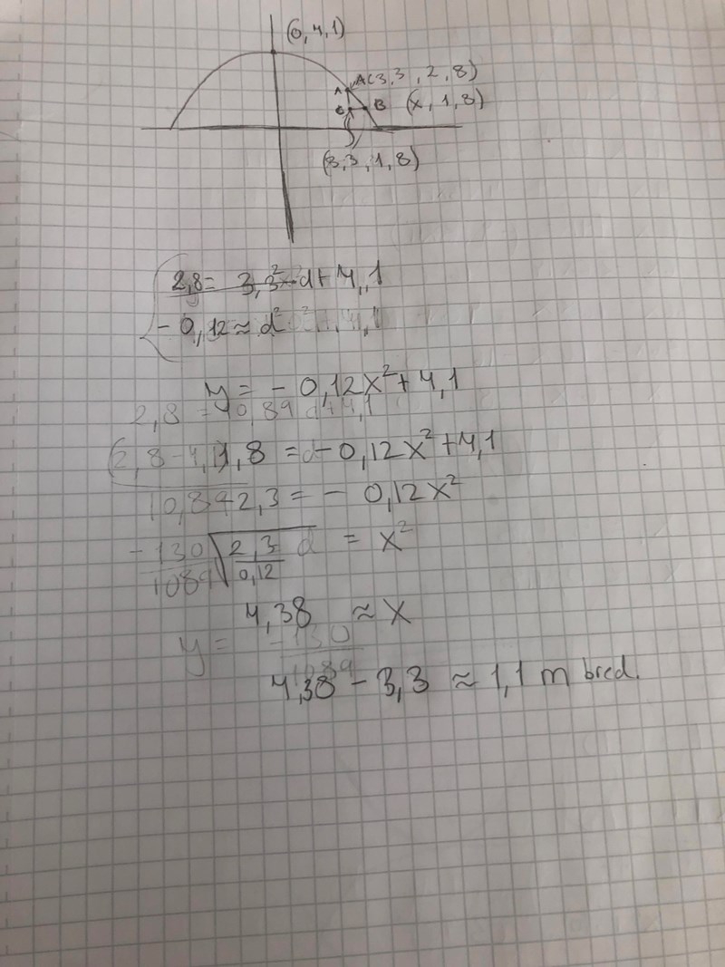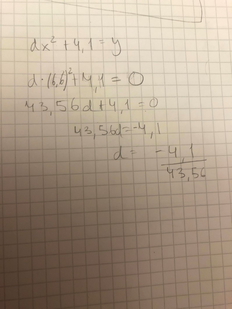 (3,3, 0) är nere på marken och inte intressant. y = 4,1 i högsta punkten med x=0. Dra ifrån a=1,3.